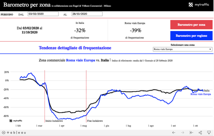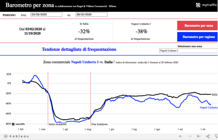 Il traffico pedonale nazionale, infatti, era ripartito nei mesi successivi al blocco di questa primavera con un preoccupante -66% rispetto al periodo precedente la pandemia di COVID-19 ed è risalito al -22% nella prima metà del mese di ottobre.