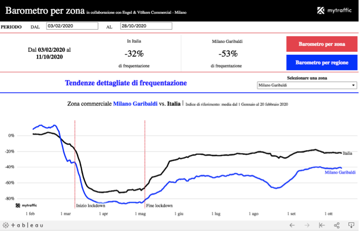 Ad esempio, analizzando il traffico pedonale nell’area a vocazione terziaria di Milano Porta Nuova Garibaldi, uno dei quartieri cittadini più ricchi d’Europa nel quale hanno sede – tra le altre – anche 3 società presenti nella classifica di Fortune 500, si evidenzia un recupero del 40% del traffico pedonale giornaliero abituale, con un passaggio da -82% dopo il blocco primaverile a -42% d’inizio ottobre